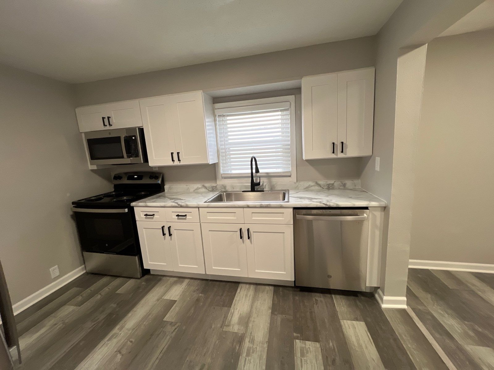 Inside, you will find a bright open layout with new flooring, fresh paint, and updated finishes throughout. The modern kitchen is equipped with new appliances, updated countertops, and ample cabinet space. Each bedroom offers generous sizing and natural light, creating a warm and inviting atmosphere.